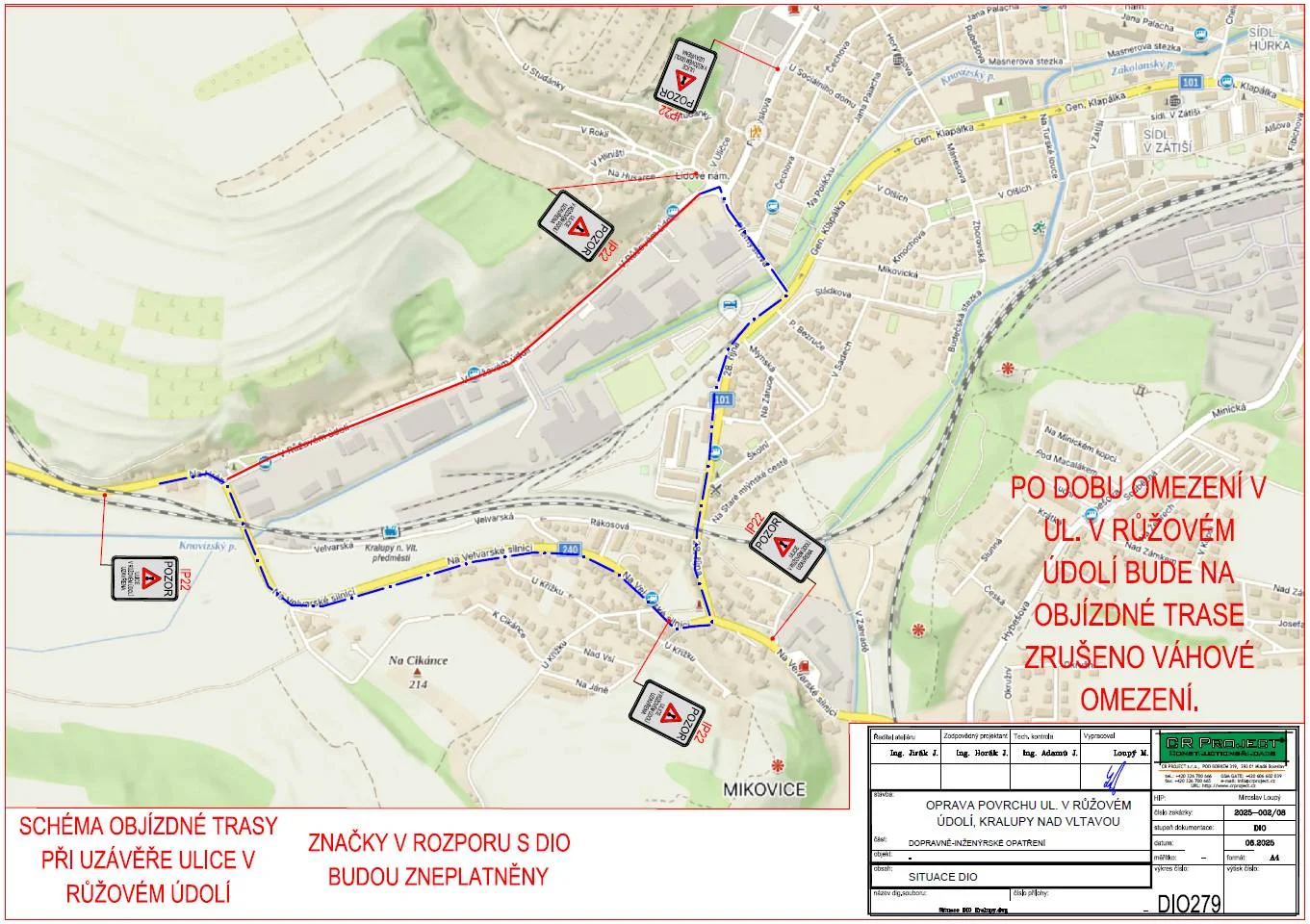 Objízdná trasa pro dopravu povede po komunikaci Na Velvarské silnici, dále, pak ulicemi 28. října a Přemyslova. Po dobu stavby v ulici V Růžovém údolí bude na objízdné trase zrušeno váhové omezení.