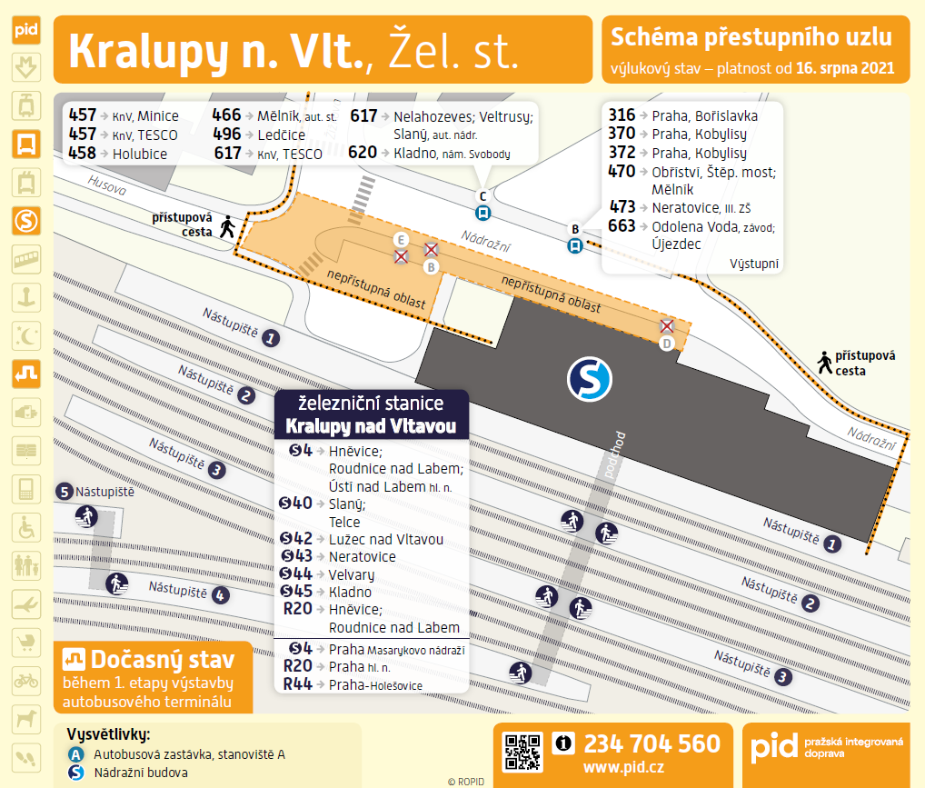 V době první etapy (až do 15. 10. 2021) se chodci dostanou do nádražní budovy z rozhraní ulic Žižkova a Husova, a to prozatímním vchodem (ze strany budovy ČD). Opačný směr vede pak po stejné trase (chodec je opět nucen se dostat na roh zmíněných ulic).
