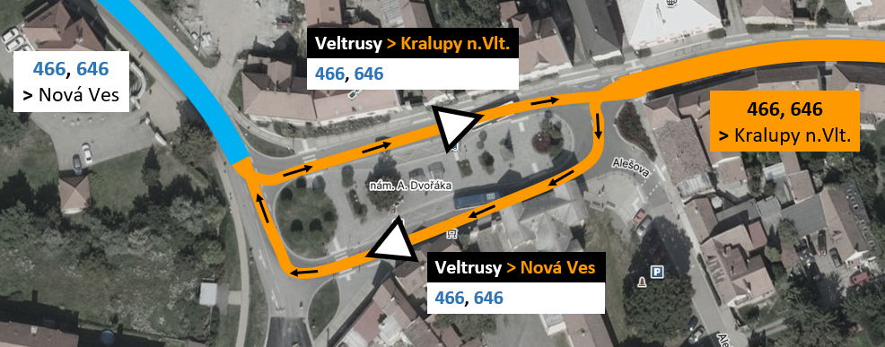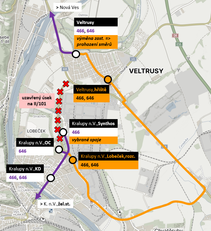 Spoje budou v úseku Veltrusy – KnV, kulturní dům obousměrně odkloněny po silnici II/608 a ulicí V Pískovně. Do zastávky KnV, Synthos zajedou pouze vybrané spoje (kromě linky 646 – zajíždí k KnV,OC). Všechny spoje však budou náhradou obsluhovat zastávku KnV, Lobeček, rozc.