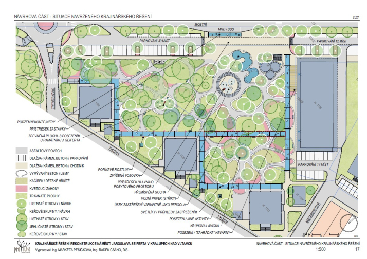 Zmíněný prostor, jenž se nachází naproti Kulturnímu a společenskému středisku Vltava, byl před lety založen jako tzv. parkové náměstí. Jeho původní klady spočívaly předně v širokém množství vegetace a dominujících trávníkových plochách s lavičkami. V neposlední řadě nelze opomenout ani zastřešené kolonády a dříve funkční kašnu. Většina těchto prvků se během dvanácti měsíců dočká zasloužené obnovy.