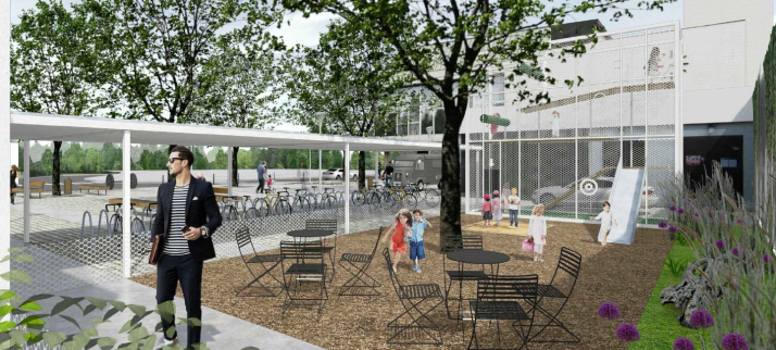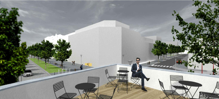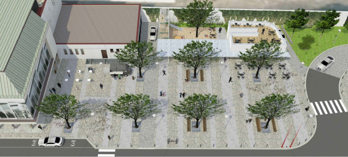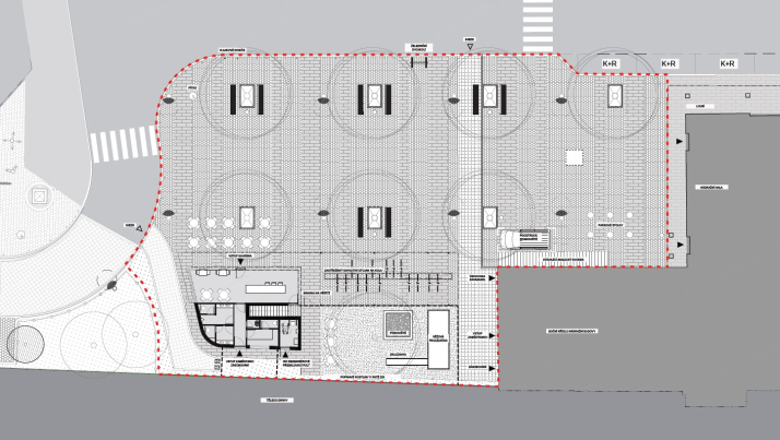 Pohled na prostor před nádražím. Navrženy jsou nové povrchové plochy, mobiliář, osvětlení a výsadba stromů.