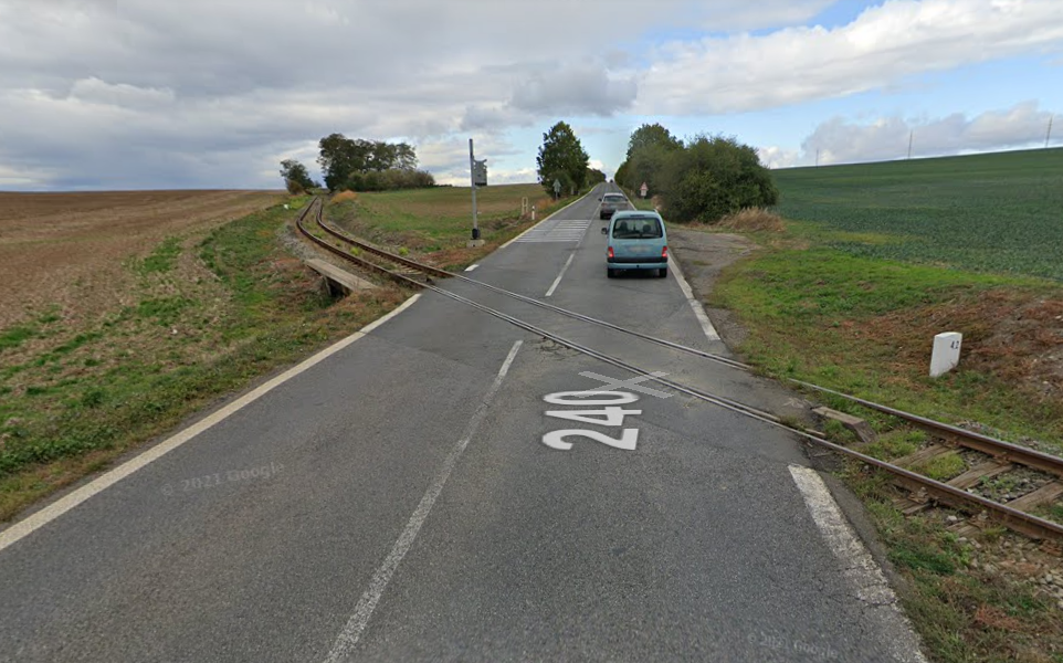 P2104 – jedná se o první železniční přejezd bez závor ve směru z Kralup nad Vltavou do Velvar (silnice č. II/240).
