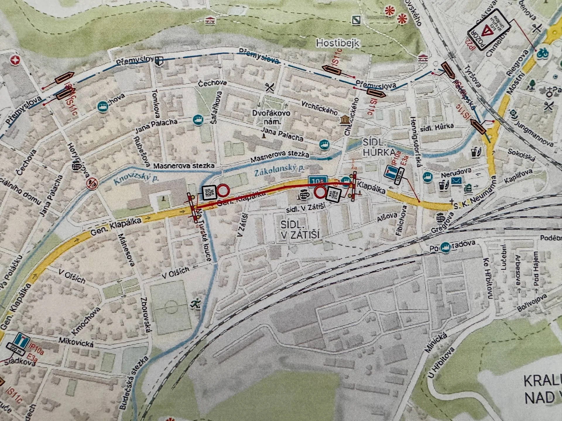 Práce v této ulici se bohužel neobejdou bez nutnosti vyparkování vozidel v blízké destinaci. Jedná se o ulice Mánesova (bude sloužit jako objízdná trasa), V Zátiší (bude zprovozněna jako obousměrná) a ústřední Generála Klapálka.